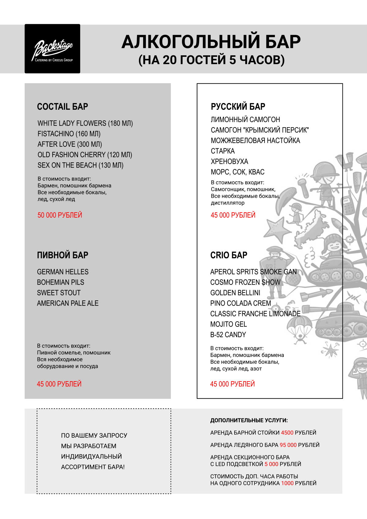 Праздники и торжества требуют тщательной подготовки и планирования, а это отнимает немало сил и времени. Быстро и легко организовать банкет для компании друзей и близких, коллег или партнеров предлагает желающим выездной ресторан «BACKSTAGE CATERING», где специально для гостей собраны в меню интересные блюда и популярные напитки.