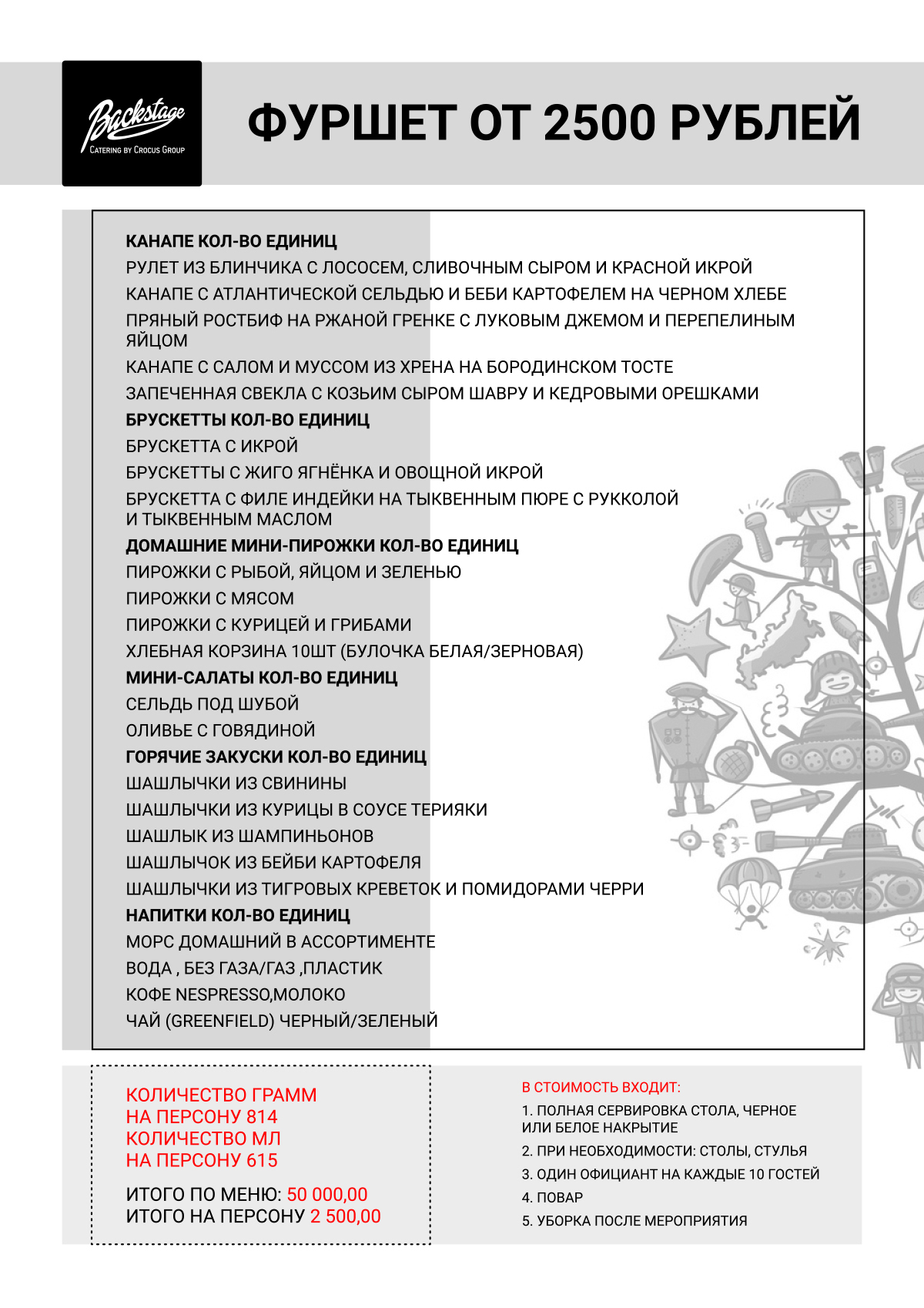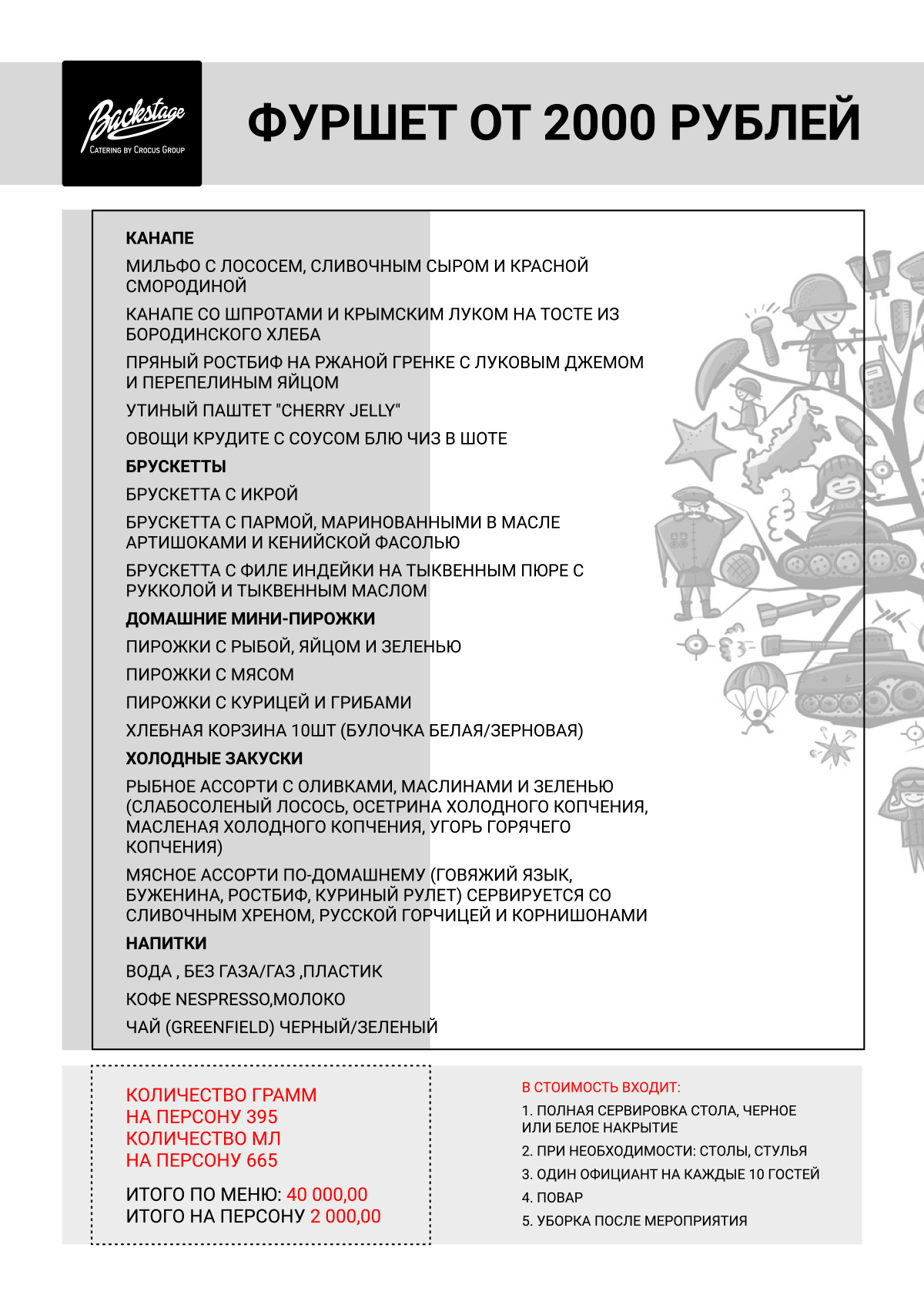 Наша гастрономическая банкетная площадка, объединяет кухни и формат обслуживания от всех ресторанов группы Restaurants by Crocus Group. Более 15 лет опыта банкетной службы обеспечивает высокий уровень обслуживания мероприятий и качество сервиса. Индивидуальный подход к каждому событию, формированию меню, составлению персонального предложения в соответствии с пожеланиями клиента – наши главные принципы работы, которые являются залогом успеха всех наших событий и формируют положительные отзывы у гостей.